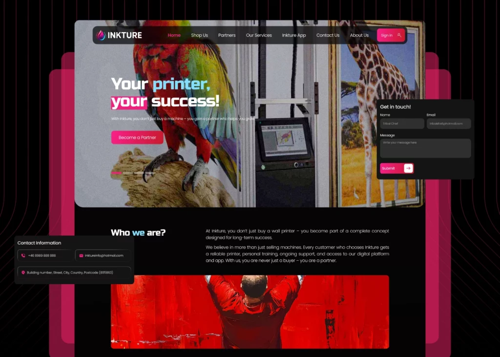 InkTure was designed as a comprehensive platform for wall printing partners to manage inquiries, clients, and services efficiently within a single ecosystem. The client needed a reliable solution that allows easy control over daily operations, content updates, and partner interactions, while ensuring a fast, smooth experience on both web and mobile devices.